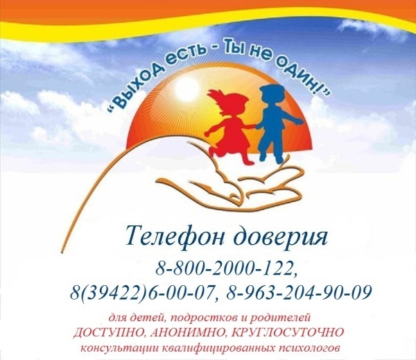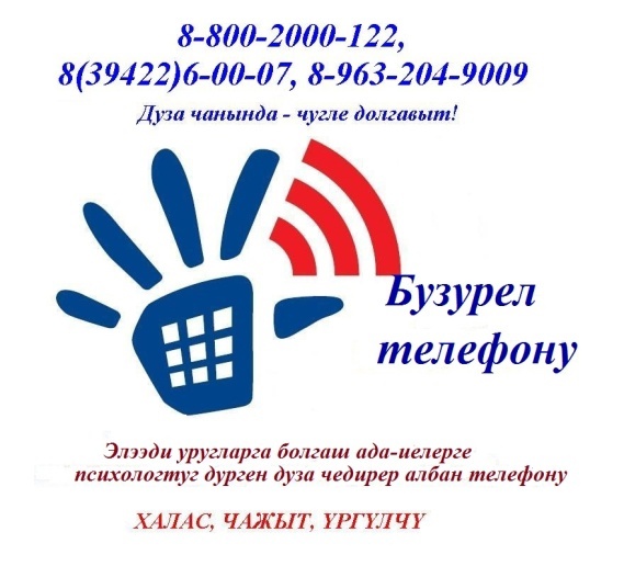 В Республике Тыва начал работу телефон доверия (служба экстренной психологической помощи) с единым всероссийским номером. 8-800-2000-122. или 6-00-07, сотовый: 89632049009. Деятельность Телефона доверия заключается в оказании детям и их родителям (лицам их заменяющим) экстренной консультативно-психологической помощи по телефону, в том числе в случаях жестокого обращения и насилия в отношении детей, включая случаи сексуального насилия, как в семье, так и вне ее. Консультации проводят психологи высшей категории, специализирующиеся на работе с семьей и детьми.