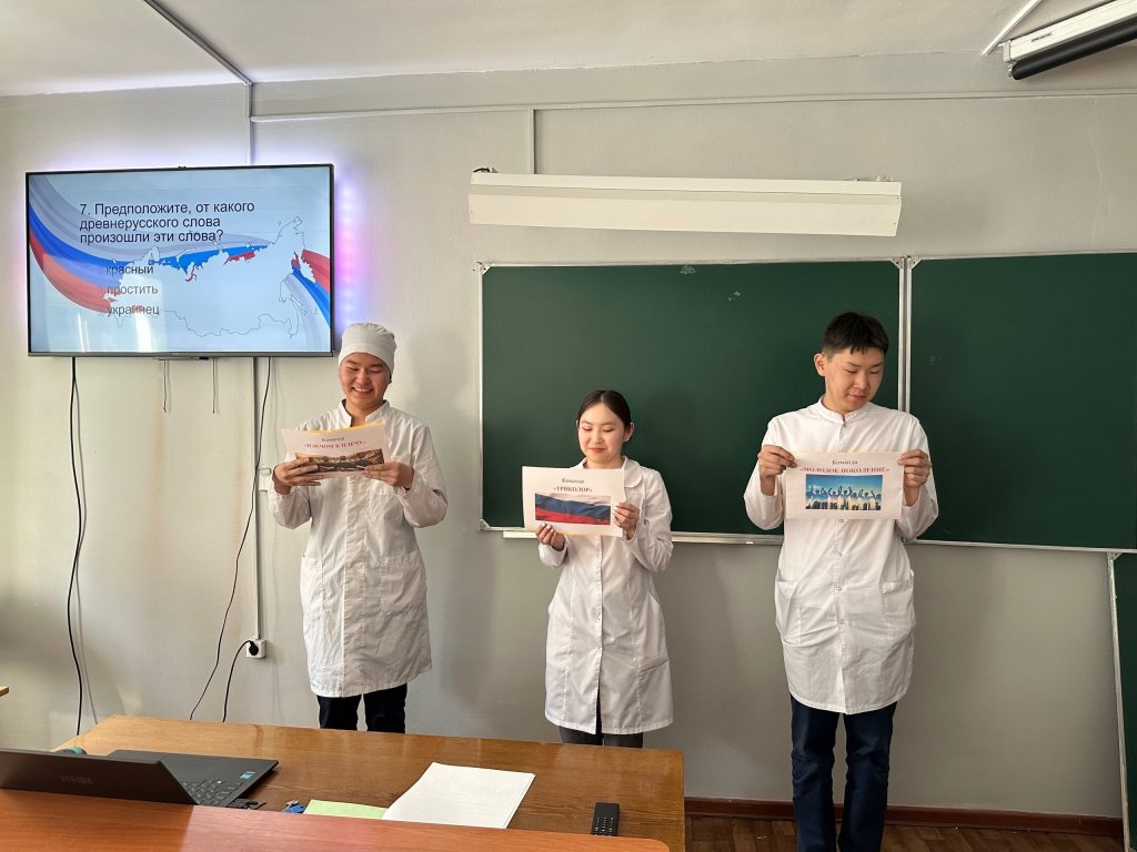 Для студентов 1 курса 6 группы отделения Сестринское дело советником директора по воспитанию Чинмит-оол С.Д. и преподавателем истории Лама Ч.Д. проведено внеурочное занятие по истории «От Руси к России».