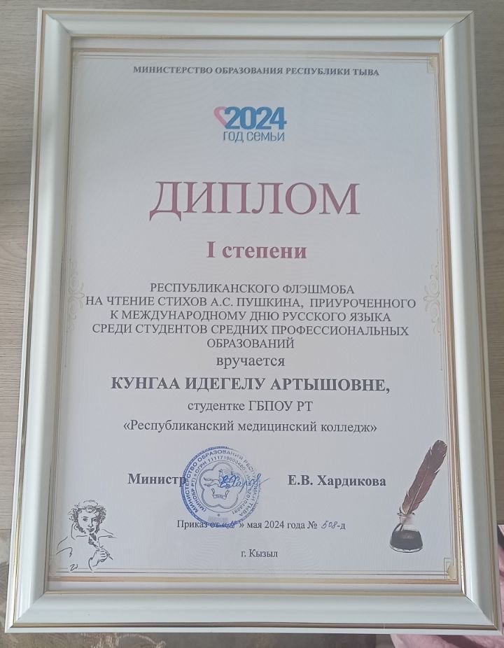 В результате конкурса обучающаяся 1 курса 7 группы Кунгаа Идегел завоевала 1 место среди студентов средних профессиональных образовательных учреждений Республики Тыва.