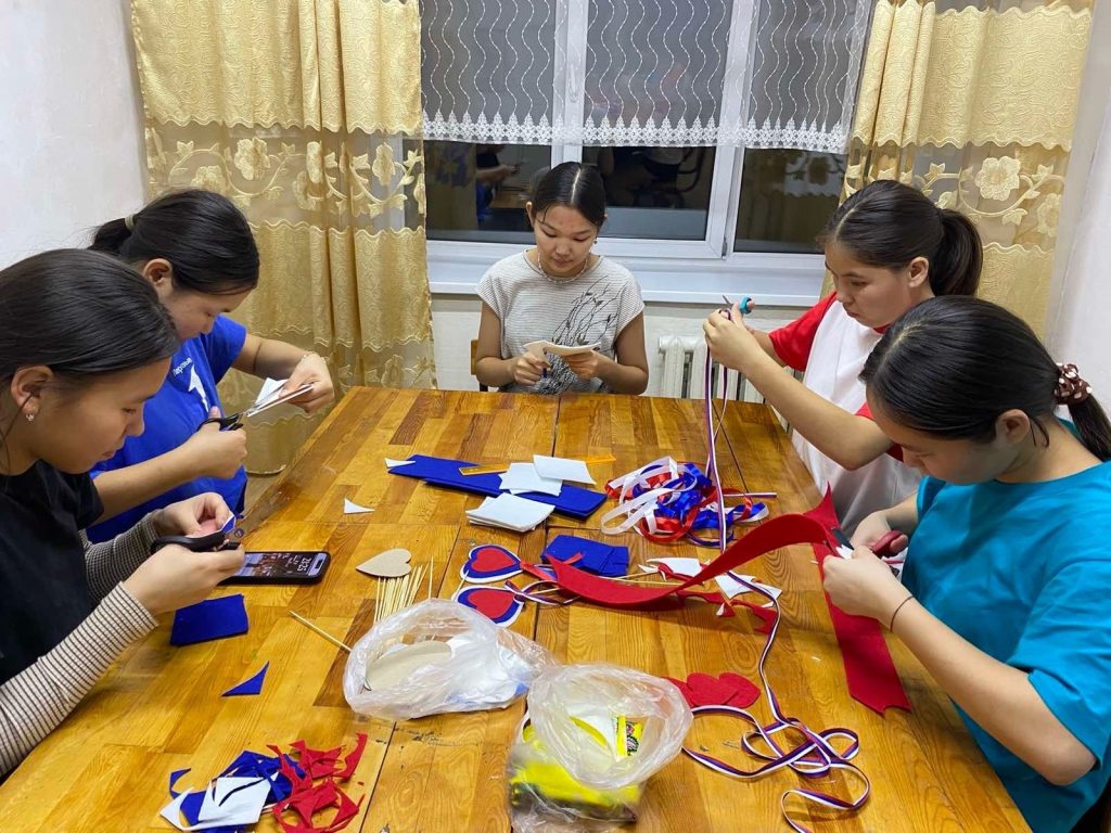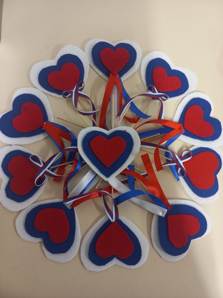 Накануне великого праздника Дня единства народов России, дежурные воспитатели Салчак Р.А. и Кужугет Н.Б. для студентов, проживающих в общежитии, провели мастер-класс по изготовлению небольших сувенирчиков из фетра в виде сердечек в цветах российского флага: