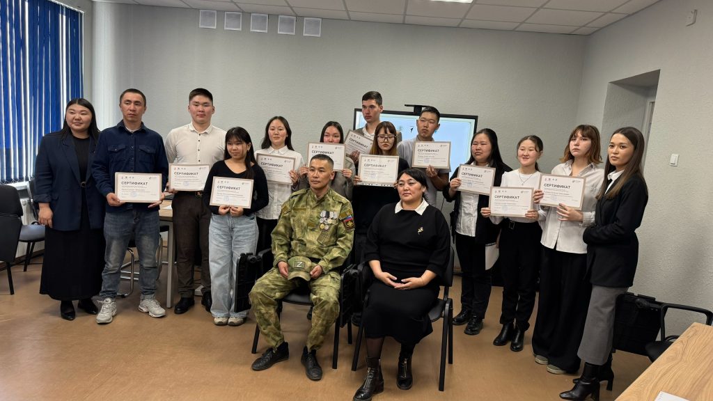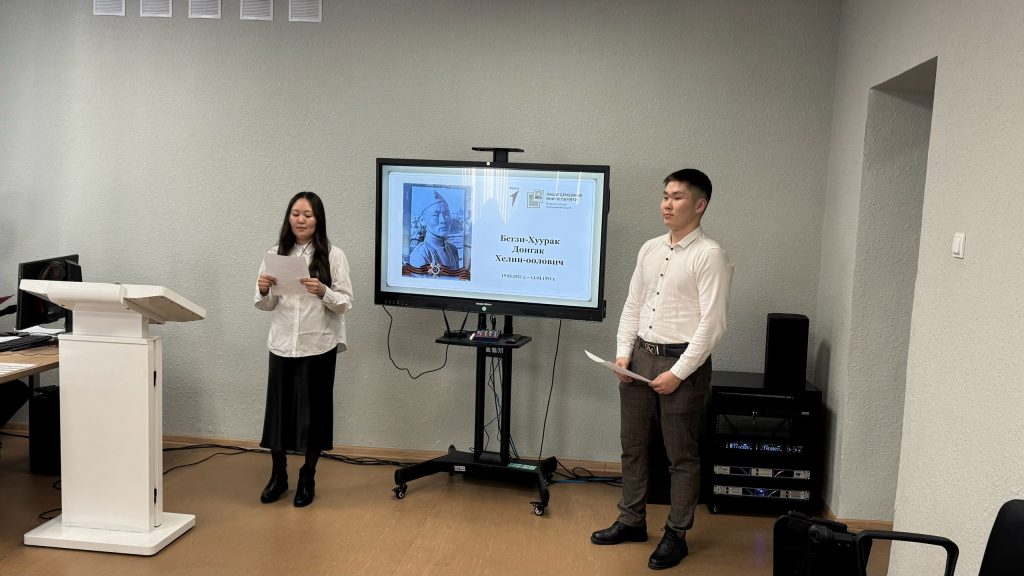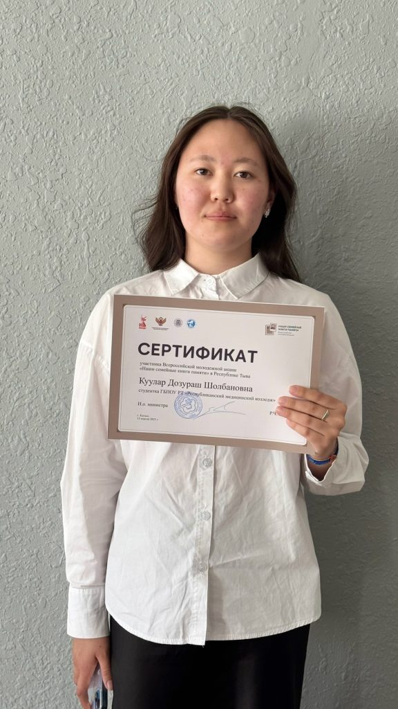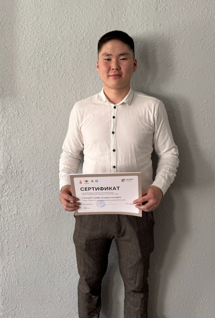 15 апреля на базе Тувинского строительного техникума состоялась всероссийская молодежная акция «Наши семейные книги памяти», посвященная Году Защитника Отечества и 80-летию Великой Победы. Суть акции: обучающиеся изучают страницы историй своих семей, относящихся к участию родственников в Великой Отечественной войне, а также в тылу. На основе изученных материалов каждому участнику предлагалось подготовить публичное выступление с рассказом о своем родственнике, принимавшем участие в войне. Студенты Республиканского медицинского колледжа Куулар Дозураш (1 курс 5 группа СД) и Сундуй Самба (2 курс 7 группа СД) рассказали о своем прадеде, участнике Великой Отечественной войны, Арзылан Моге ТНР- Бегзи-Хуураке Донгаке Хелин-ооловиче. Наши семейные книги памяти — это не просто страницы и слова. Это настоящая находка для каждого, кто хочет узнать о своей истории, своих корнях. Важно сохранить воспоминания о предках, их подвиге и жизни, чтобы молодое поколение могло гордиться своим наследием и понимать, как важно ценить семью и культурные традиции.