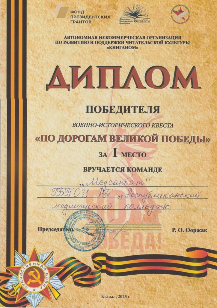 29 апреля в рамках проекта «По дорогам Великой победы» прошёл квест, приуроченный 80-летию Победы и Году Защитника Отечества. Организаторами выступили АНО «Книга Ном», ГБУ «Национальная библиотека им. А. С. Пушкина Республики Тыва», ФКУ «Военный комиссариат Республики Тыва» и Управление Федеральной службы войск национальной гвардии Российской Федерации по Республике Тыва.