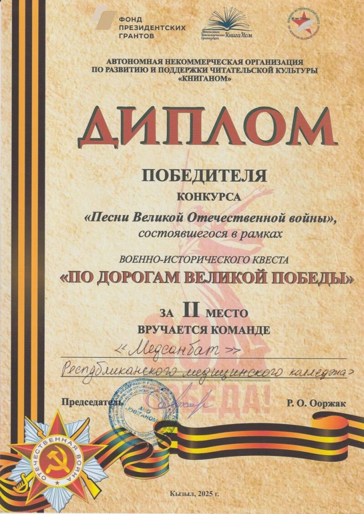 В квесте приняли участие 10 команд профессиональных образовательных учреждений Республики Тыва. Команда «Медсанбат» ГБПОУ РТ «Республиканский медицинский колледж» под руководством преподавателя истории и обществознания Лама Ч. Д. второй год подряд заняла первое место!