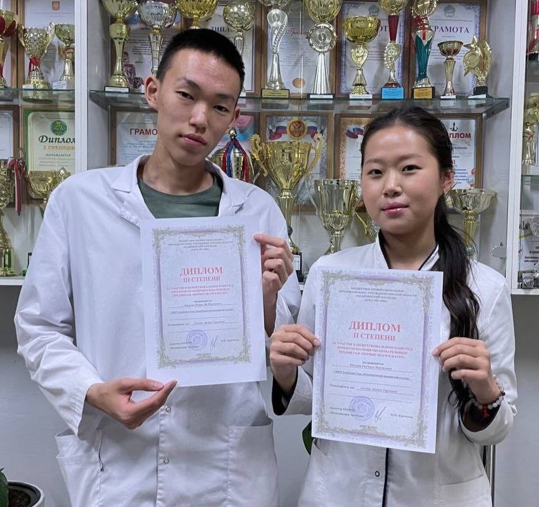Студенты 1 курса 6 группы ГБПОУ РТ «Республиканский медицинский колледж» Монгуш Ринчина и Монгуш Начын стали призёрами межрегионального заочного конкурса проектов по общеобразовательным предметам «Первые шаги в науку», который проводился в соответствии с планом-графиком работы Совета директоров средних медицинских и фармацевтических образовательных учреждений Сибирского Федерального округа и Сибирской межрегиональной ассоциации работников системы среднего профессионального медицинского образования БПОУ Омской области «Медицинский колледж».