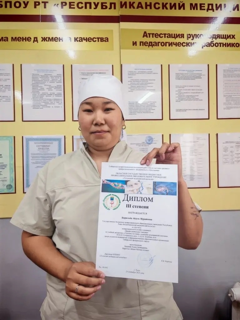25 сентября 2025 года в ОГБПОУ «Тулунский медицинский колледж» состоялась межрегиональная студенческая онлайн-олимпиада по дисциплине «Генетика человека с основами медицинской генетики». В мероприятии приняли участие студенты специальности 34.02.01 «Сестринское дело».Олимпиада была направлена на проверку знаний, умений и практического опыта студентов в соответствии с требованиями ФГОС СПО по генетике. Под руководством преподавателей Лакпаевой А. Д. и Кара-Сал А. Ч. в онлайн-олимпиаде приняли участие студенты нашего колледжа: Бюрюльба Айгуль (2 курс, 7 группа), Баткар Вероника (3 курс, 7 группа), Кунгаа Идегел (3 курс, 7 группа) и Кыргыс Даяна (3 курс, 6 группа).По итогам олимпиады Айгуль Бюрюльба (2 курс 7 группа) была удостоена диплома III степени.Поздравляем Айгуль с достижением и желаем ей дальнейших успехов в учёбе!