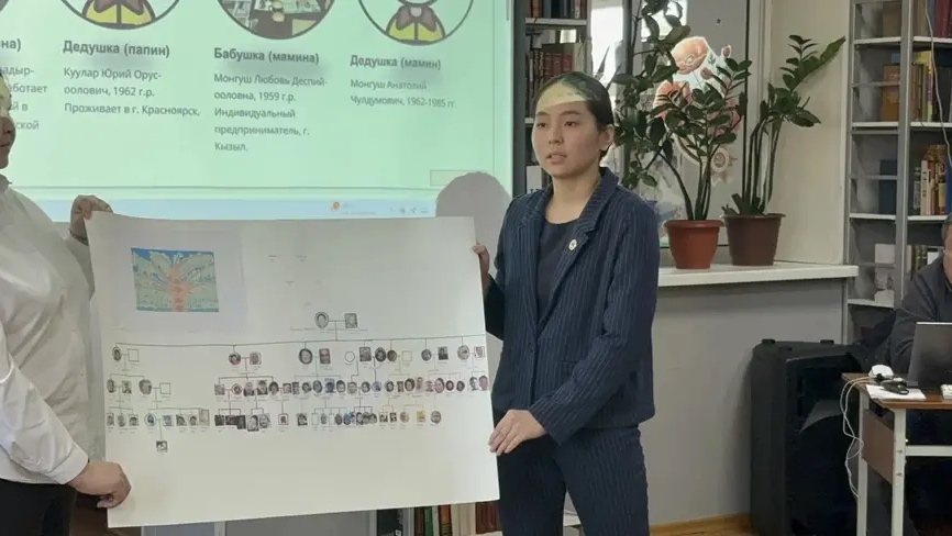 Кристина Ховалыг, первокурсница Республиканского медицинского колледжа, поделилась своими исследованиями о родословной, подчеркнув важность знания своих корней, особенно в контексте объявленного в республике Года созидательного труда и семейных ценностей.