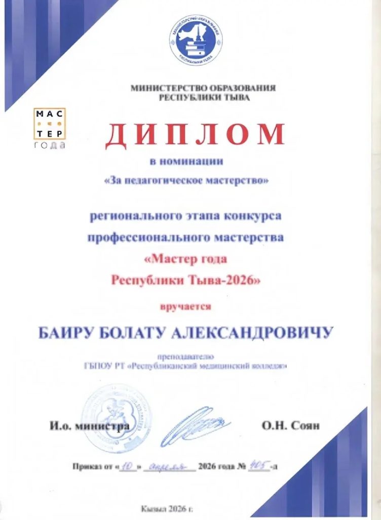 Преподаватель информатики Республиканского медицинского колледжа Баир Болат Александрович достойно представил наше учебное заведение на региональном этапе престижного конкурса профессионального мастерства «Мастер года».