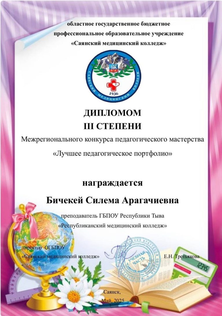 В мае месяце по плану Сибирской ассоциации медицинских и фармацевтических организаций Сибирского Федерального округа был проведен конкурс профессионального мастерства «Лучшее педагогическое портфолио». Опытный преподаватель анатомии Республиканского медицинского колледжа Бичекей Силема Арагачыевна заняла в конкурсе почетное 3 место. Мы гордимся вашими…