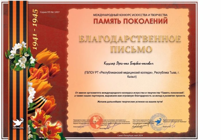 Студент 2 курса 3 группы Ооржак Артына стал лауреатом 1 степени Международного конкурса искусства и творчества «Память поколений» (Санкт-Петербург, май 2024).А студентка 2 курса 6 группы Тюлюш Норжун стала дипломантом 1 степени Международного фестиваля-конкурса «Шепот звезд», организованного Международным центром заочных…